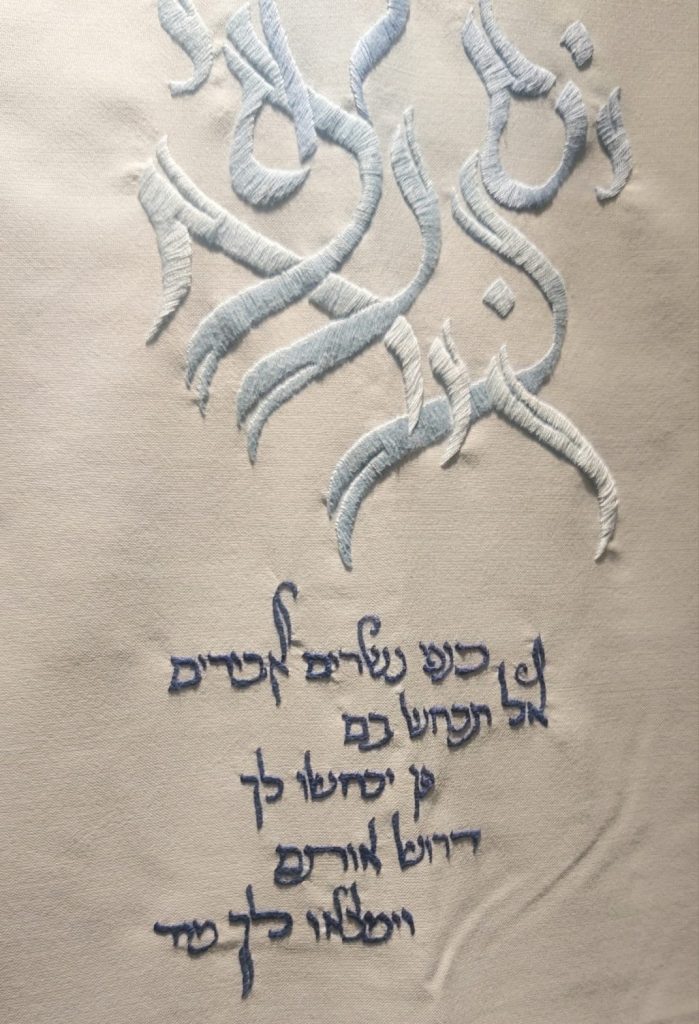 הטקסט רקום כמשפט אחד, ללא סימני פיסוק, כאילו נקרא בנשימה עצורה, ורק בסופו נקודה. מעליו ומתחתיו רקומות שורות שיבולים המדמות את הפסים בדגל.